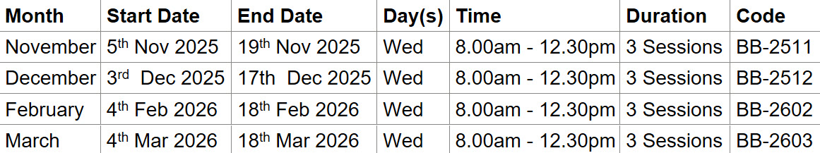 This course is 12 hours in total, undertaken over 3 x 4 hour sessions over a 3 week period.