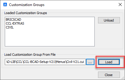 - In BricsCAD run the MENULOAD command, select the downloaded cui file, then pick the Load button.